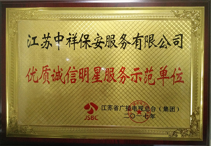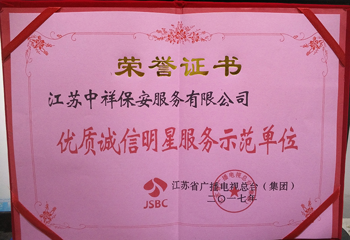 中祥保安公司榮獲江蘇省廣播電視總臺(tái)2017年優(yōu)質(zhì)誠(chéng)信明星服務(wù)示范單位